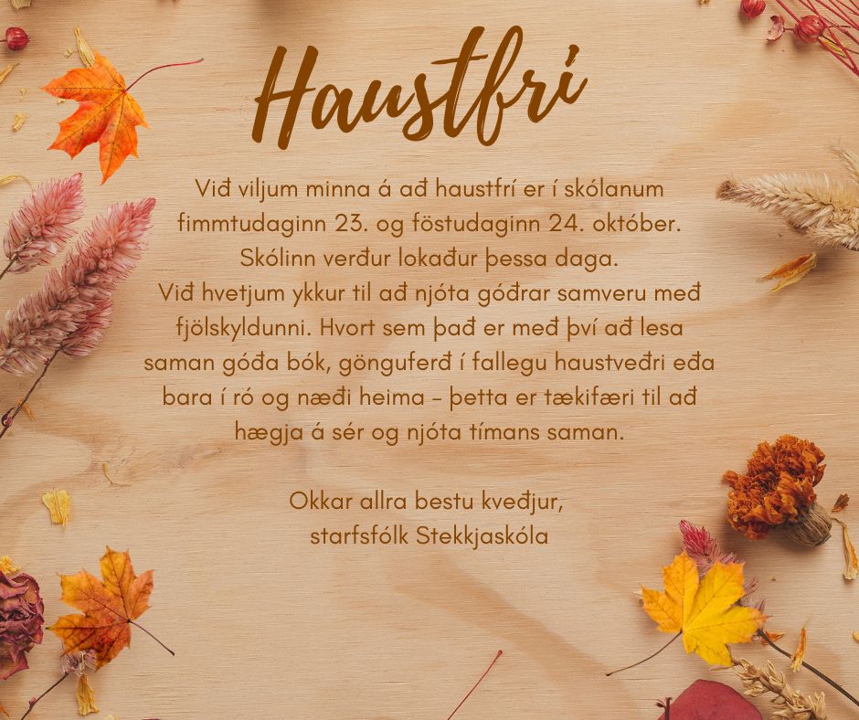 Lesa Meira >>Framundan er skertur skóladagur og starfsdagur. Skertur dagur – fimmtudaginn 9. október Þá lýkur skóla hjá öllum kl. 13:00. Nemendur í frístund fara beint eftir skóla í hefðbundið frístundastarf. Nemendur sem […]