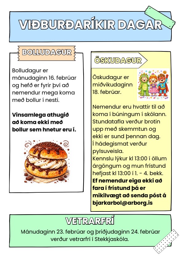 Framundan eru viðburðarríkir dagar í Stekkjaskóla, þ.e. bolludagur, sprengidagur og öskudagur. Jafnframt er vetrarfrí framundan. Mánudaginn 16. febrúar er bolludagurinn og þá mega nemendur koma með bollur í nesti. Munið […]