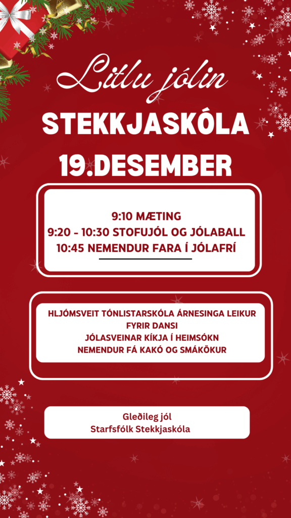 Starfsfólk Stekkjaskóla óskar nemendum, forráðamönnum og öðrum velunnurum skólans gleðilegra jóla og farsældar á komandi ári. Við þökkum fyrir ánægjulegt og gott samstarf á árinu sem er að líða. Kennsla hefst á nýju ári þriðjudaginn 6. janúar 2026 samkvæmt stundatöflu. Skrifstofa skólans opnar eftir jólaleyfi mánudaginn 5. janúar 2026. Sjá nánar hátíðarkveðju hér. Bestu […]