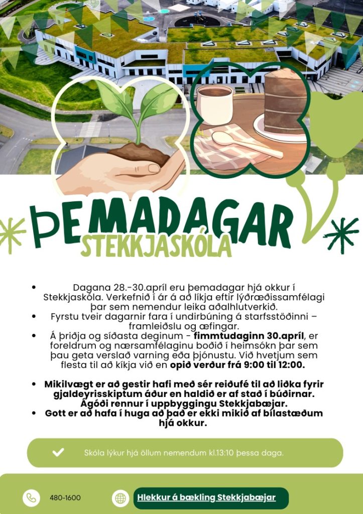 Á morgun, 28. apríl, hefjast þemadagarnir hér í Stekkjaskóla. Þemadagarnir standa yfir í þrjá daga, 28. – 30. apríl. Þessa daga hefst skóli eins og venulega kl. 8:10 en skóla lýkur kl. 13:10 hjá öllum nemendum. Opið hús verður í skólanum á fimmtudaginn frá 9:00-12:00 þar sem hægt verður að kaupa afrakstur þemadaganna. Hér má […]