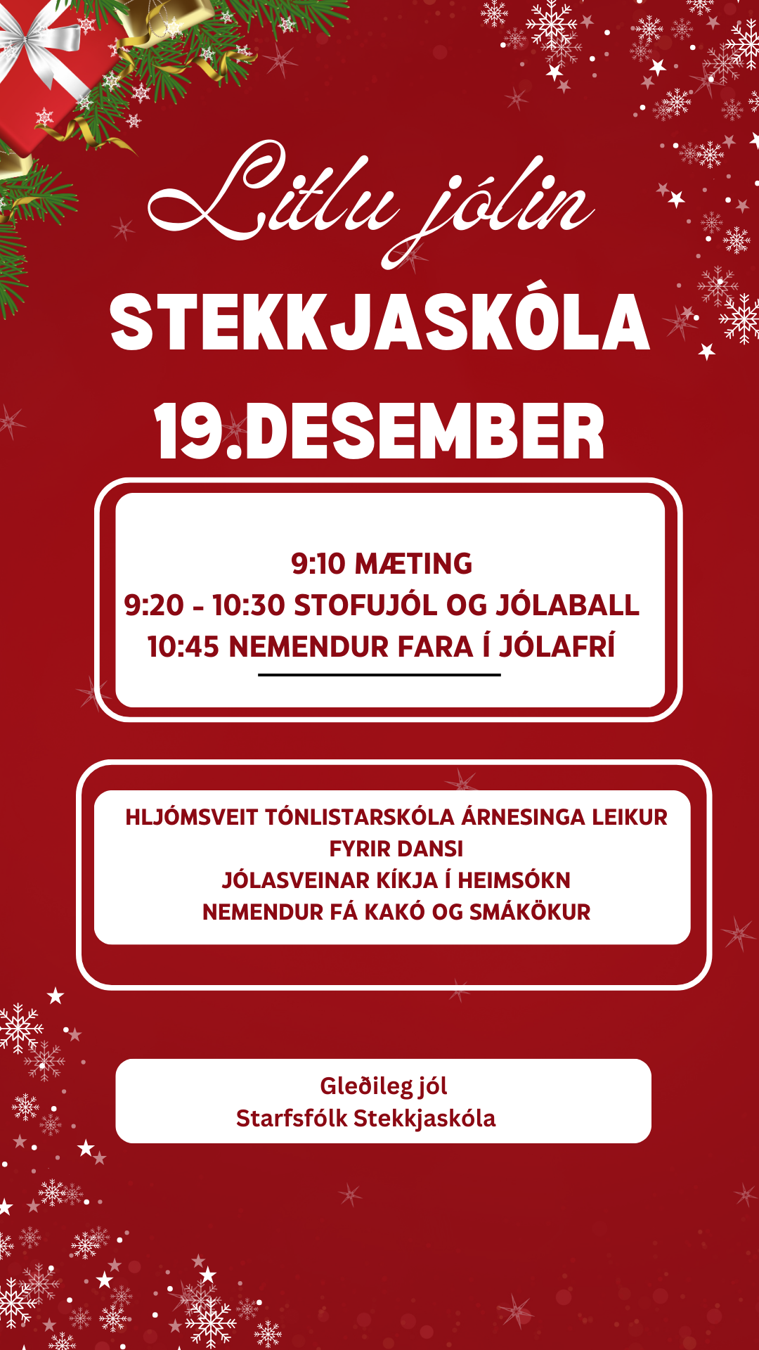 Starfsfólk Stekkjaskóla óskar nemendum, forráðamönnum og öðrum velunnurum skólans gleðilegra jóla og farsældar á komandi ári. Við þökkum fyrir ánægjulegt og gott samstarf á árinu sem er að líða. Kennsla hefst á nýju ári þriðjudaginn 6. janúar 2026 samkvæmt stundatöflu. […]