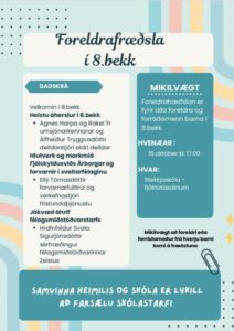 Þriðjudaginn 16. september verður foreldrafræðsla fyrir foreldra/forráðamenn nemenda í 8. árgangi. Fræðslan verður haldin í fjölnotasal skólans fyrir innan matsal og hefst kl. 17:00. Mikilvægt er að foreldri eða forráðamaður frá hverju barni komi á fræðsluna. Sjá nánar auglýsingu hér.